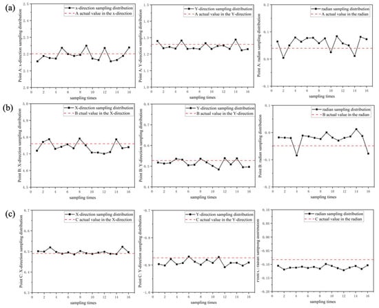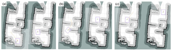 In this experiment, the robot was set to move autonomously from the starting point to the target point, and three passing points, A, B, and C, were set during the movement. The robot stayed for five seconds each time it passed, and the x, y, and Angle values of the starting point were manually measured. A, B, and C do the same work. The experiment was repeated 16 times, and the measurement data from passing through the three points A, B and C were recorded each time, and the data was compared with the data from the first time, so as to judge the positioning error of the robot in the complex environment. The robot motion process is shown in Figure 9a–c.