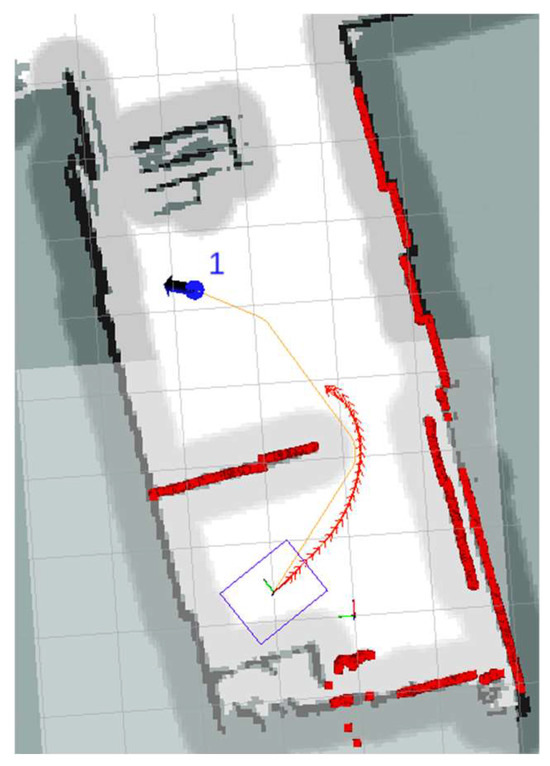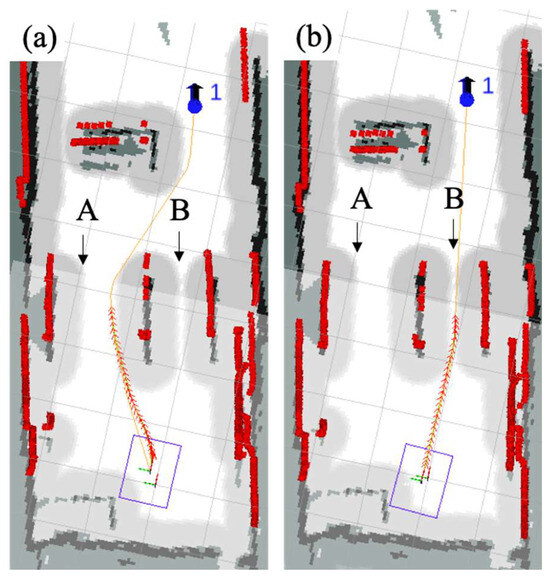 In the experimental environment, shown in Figure 11, we set up a wider channel A and a narrower obstacle channel B. The traditional TEB algorithm would choose channel B in Figure 11, but this would lead to the robot being too close to the obstacle when passing through the obstacle, which would result in a higher risk of rubbing against the obstacle. The improved TEB algorithm introduced a criticality coefficient to adjust the distance between the path points and the obstacles in the path planning, and chose the wider channel A in Figure 11, which was more favorable for safe passage of the robot. The experimental results verify the effectiveness of the improved TEB algorithm in selecting safe trajectories.
