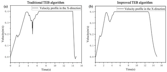 The velocity curve of the robot in the X direction (a) before the improvement of the TEB algorithm and (b) after the improvement of the TEB algorithm.