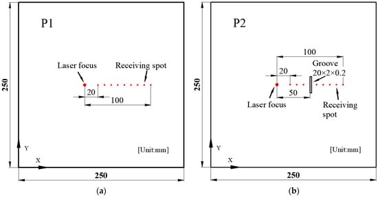 The copper plate specimen has dimensions of 250 mm × 250 mm × 0.5 mm. To simulate surface defects on the copper plate, a groove is machined on the surface, as depicted in Figure 1. For comparisons, a defect-free copper plate is labeled as P1, and a copper plate with a defect is designated as P2 with grooves of 20 mm × 2 mm × 0.2 mm. The laser focal point is fixed in the experiment, while the receiving spot moves in parallel with a step size of 2 mm. The distance from the laser focus to the receiving spot increases from 20 mm to 100 mm. The material properties are listed in Table 1.