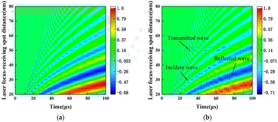 Laser LW spatial-temporal wavefield. (a) Defect-free copper plate P1. (b) Defect copper plate P2.