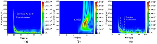 As shown in Figure 3, a time–frequency analysis is conducted through CWT. The Morlet wavelet is chosen as the mother wavelet. The LW spectrum primarily distributes in the range of 0 to 2 MHz. It is important to note that higher-order modes have not been detected within this frequency range. In Figure 3a, the time–frequency representation demonstrates a strong resemblance to the theoretical curve of the A0 mode. An energy peak is evident, occurring at 24.5 μs. In Figure 3b, the time–frequency representation is generated by the LW displacement from 0 to 15 μs based on CWT. A distinct signal associated with the S0 mode displays around 1.5 MHz, which can be found in Figure 3c. The energy with respect to the defect is located at approximately 370 kHz, which corresponds to maximum intensity [28]. It is noteworthy that the time–frequency analysis lacks the precise spatial resolution for defect localization [46].