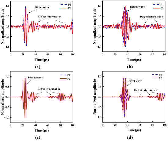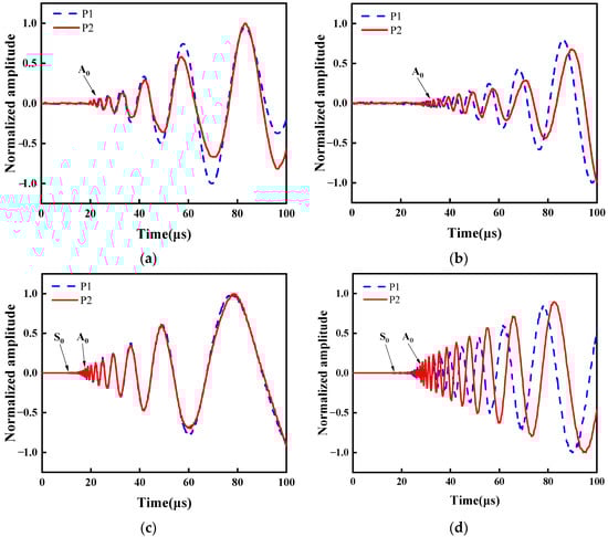 LW time-domain signals are presented in Figure 6. This demonstrates the evident displacement with respect to the dispersion characteristic [52]. As plotted in Figure 6a, the displacement amplitude is low between 0 μs and 20 μs. From 20 μs to 100 μs, displacement amplitude increases gradually. Around 10 μs, the S0 mode was not observed. The S0 mode is primarily in in-plane displacement, with minor displacement perpendicular to the surface. Therefore, it could be measured by laser interferometer. The A0 mode is evident from the prominent dispersion observed in Figure 6a. The displacement at a laser focus-receiving spot distance of 40 mm for plates P1 and P2 is synchronized in Figure 6a, whereby a noticeable time delay occurs at a laser focus-receiving spot distance of 60 mm in Figure 6b. This reveals no significant displacement variation on the P2 plate attributed to the reflection of the defect signal, so it is difficult to recognize defects by LW displacement. Nevertheless, this does not imply that the reflected signal has not been generated due to a defect. Further analysis of the LW signal in the time domain is imperative for extracting the defect signal. Figure 6c,d depicts the LW time-domain signals simulated using FEM. S0 mode and A0 mode can be found. These FEM results are consistent with the corresponding experimental results, thus confirming the accuracy of the experimental findings.