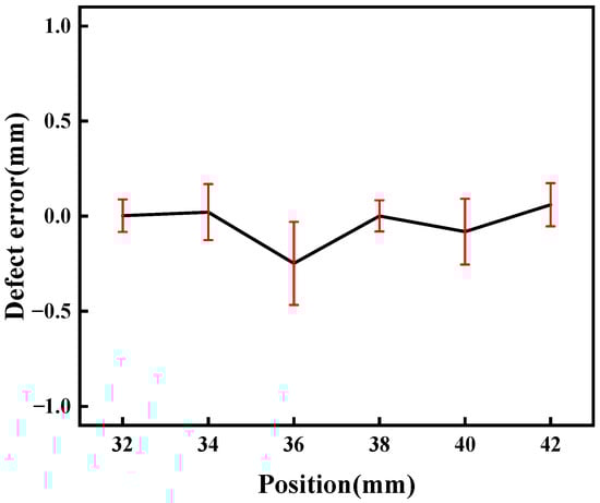 The relative error of the defect measured at various laser focus-receiving spot distances is plotted in Figure 8. It varies for determining the defect wave when the receiving point is close to the defect. Therefore, six measuring points were selected to improve the accuracy, and the average error is reduced to 0.14%. The minimum error is derived at a distance of 12 mm from the defect, and the largest one is obtained at a distance of 14 mm. This indicates the feasibility of determining the defect location using the reflection signals of the defect.