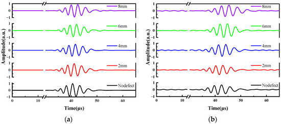 During the experiment, the laser’s single pulse energy is set to 50 mJ. This setting ensure effective excitation of ultrasonic signals through the thermoelastic mechanism and guarantees the integrity of the copper plate [49]. Thirty-two pulses of repetition were averaged at the same location to improve the signal-to-noise ratio. These ultrasonic signals acquired via digital oscilloscope were processed by custom-written MATLAB software (version 2021a). IQ demodulation is used to extract the ultrasonic signal and generate time-resolved surface displacement resulting from the propagation of LWs [50,51]. Subsequently, the displacement was analyzed in both the time and frequency domains. The time resolution can achieve 1 ns. In the experimental samples, five samples with different defect widths were selected, with widths of 2 mm, 4 mm, 5 mm, 6 mm, and 8 mm, respectively. Their positional dimensions are the same as those shown in Figure 2b. The distance between the laser focus and the left side of the defect is 50 mm.