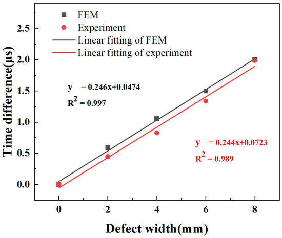 The relationships between the LW transmitted signal and defect size are presented in Figure 9. There is a downtrend of LW displacement with defect width, causing a delay in received time. This phenomenon is attributed to both energy dissipation of LWs traversing the defects and a reduction in the velocity of the A0 mode. Additionally, the waveform of the LW passing through the defect undergoes changes and causes the time fluctuations of the received signal. A linear fitting analysis was conducted to describe the variations in defect width against the time difference. The linear fit, represented in Figure 10, shows the relationship between defect width and time difference. The equations of the fitted line for FEM and experimental ones are denoted, respectively:
