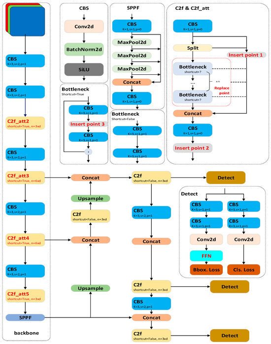 In the design of our model, as Figure 2 shows, we adhered to the same architectural paradigm as the YOLOv8 model to control for variables. We elected to utilize the sigmoid-like unit (SiLU) as the activation function, which is concatenated with the 2D convolution (Conv2d) and 2D batch normalization (BatchNorm2d) to form the CBS module. The model is segregated into three distinct components: the backbone, the neck, and the detection head. Within the backbone, we implemented the fast version of the cross-stage partial (CSP) bottleneck with 2 convolution (C2f) modules and spatial pyramid pooling—fast (SPPF) modules to expedite the feature extraction process. For the neck design, we adopted a structure that integrates the path aggregation network (PAN) with the FPN to amalgamate information from different feature maps. Ultimately, we employed a decoupled detection head that independently learns to correct localization and classification errors.