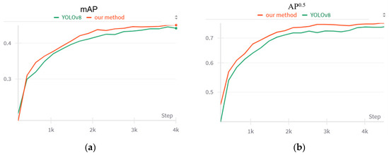 Comparison of prediction accuracy and convergence speed between our method and the YOLOv8 model. (a) Comparison of mAP between our method and the YOLOv8 model. (b) Comparison of AP0.5 between our method and the YOLOv8 model.