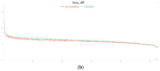 Comparison of classification loss and DFL loss between our method and the YOLOv8 model. (a) Comparison of classification loss between our method and the YOLOv8 model. (b) Comparison of DFL loss between our method and the YOLOv8 model.
