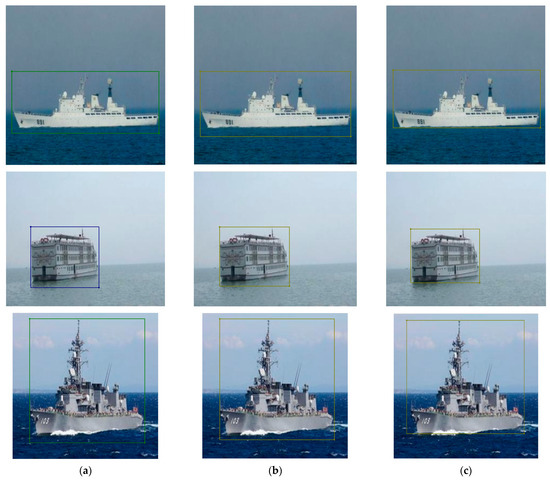 Figure 5 presents a comparative analysis of the bottom boundary predictions for surface objects between the model developed in this study and the original YOLOv8 model. In this figure, (a) signifies the actual boundary box of the target, (b) represents the predictive output from the model developed in this study, and (c) indicates the predictive output from the original YOLOv8 model. The output from our proposed strategy accounts for the size and orientation of the surface target to predict the position of the bottom boundary, in contrast to the YOLOv8 model, which has the propensity to predict directly at the point where the target intersects with the water surface.