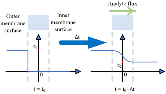 Equilibrium of analyte concentration with continuous sampling based on permeable membrane.
