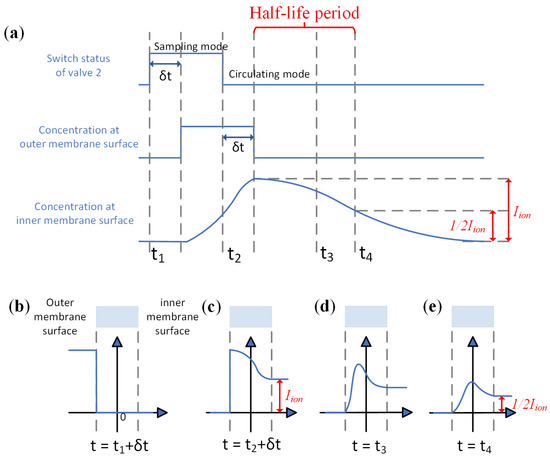 Membrane-based pulsed sampling method. (a) System timing and concentration changes. (b) Concentration distribution at moment t1 + δt. (c) Concentration distribution at moment t2 + δt. (d) Concentration distribution at moment t3. (e) Concentration distribution at moment t4.