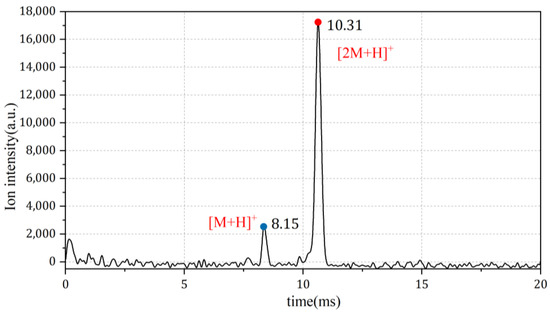 Similar observations can be made based on the IMS spectrum (Figure 6). The monomeric ion [M + H]+ appears at 8.15 ms on the spectrum, and the dimeric ion [2M + H]+ is detected at 10.31 ms. By varying the concentration of NMP, a clear trend of the relative amplitude of the monomer and dimer peaks can be observed. Starting from a low concentration, the monomer peak appears first and gets higher as the concentration increases, until the dimer peak appears. As the intensity of the dimer ion increases, the intensity of the monomer ion gradually decreases, until, eventually, the monomer peak disappears, leaving only the dimer peak visible in the spectrum.