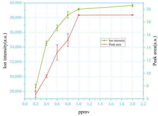 It can be observed that with the continuous sampling method, the response of the IMS signal saturates at the NMP concentration of around 1 ppm. Both characterization methods demonstrated a similar dynamic range, with ion intensity (peak height) giving the smaller error bar. Moreover, the calculation of ion intensity is relatively easier than the peak area, offering advantages for data processing and algorithm design. Therefore, the intensity of the ion current was adopted for measuring the analyte concentrations using the continuous sampling method.