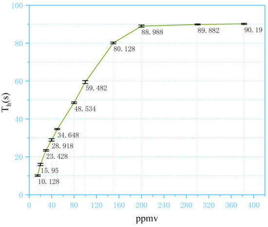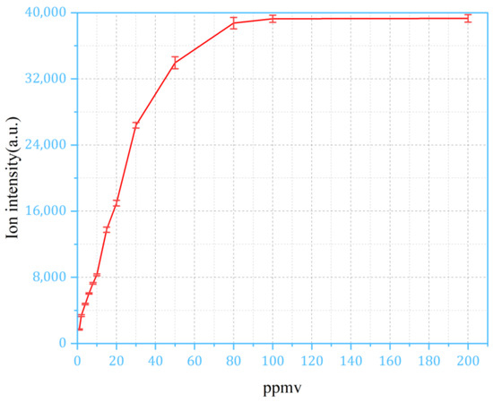 Taking Th as a measure of sample concentration, the dynamic range was effectively extended to around 200 ppm, with an improvement of two orders of magnitude compared to the conventional continuous sampling method. From Figure 12, it can be found that with concentrations higher than 200 ppm, Th did not respond to the change in sample concentration. Based on experiments with other substances, the detector can detect an ion intensity of approximately 25,000, indicating that the detector has not reached saturation. It is assumed that this is because the amount of analyte that can be injected into the membrane is eventually limited by the permeability of the membrane material. With higher concentrations, even if the concentration gradient is larger, the membrane cannot intake more analyte molecules. When the analyte was removed from the outer side of the membrane, the same amount of analyte molecules stored in the membrane ended up with the same Th. In this case, we tested the saturated vapor at 20 °C, corresponding to the concentration of 383 ppm, and the response of Th stayed relatively the same as that of 200 ppm.