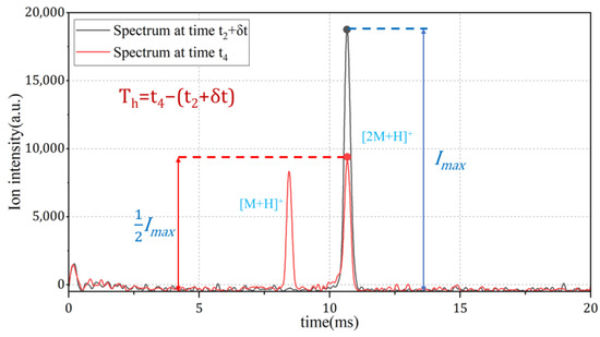 In case of concentrations higher than 80 ppm, a different indicator is required. Considering the diffusion process of the analyte, as shown in Figure 3, although the highest concentration at the inner side of the membrane stays the same, the amount of analyte molecules injected into the membrane is affected by the concentration at the outer side of the membrane. When the sampling pulse finishes, the analytes within the membrane start to diffuse to both directions, and the time constant of this diffusion process relies on the amount of analyte molecules inside the membrane and, therefore, the initial concentration of the sample gas. As illustrated in Figure 11, the half-life period of NMP, denoted as Th, which is the time it takes for the dimer peak to diminish to half of its highest level, shows that a correlation between Th and the concentration of the analyte in the sample gas can be established, as shown in Figure 12.