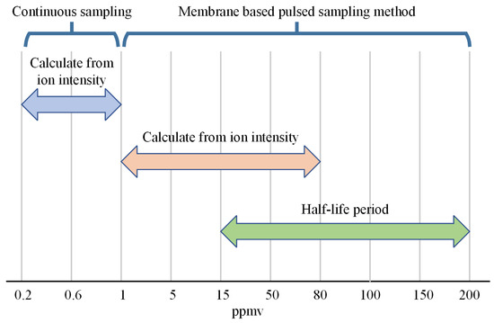 The injection time is defined as t2 − t1 in Figure 3 and set to 500 ms for all experiments. Reducing the injection time could further enhance the dynamic range, but with two limitations. First, the accuracy of the switching valve we used was 10 ms, which means that with a shorter injection time, the uncertainty of the analyte introduced into the system was significant. Second, as the analyte molecules were introduced into the gas pipe, diffusion also occurred alongside flow movement. If the injection time is too short, then by the time the analyte reaches the membrane, the concentration would significantly change. Taking those two considerations together, we chose 500 ms as a reasonable trade-off, which is adequate to demonstrate the effect of this novel method rather than obtaining the very best performance. The measurement period was set to 240 s to better eliminate the interference of contamination resulting from the measurement of the high-concentration analyte. Sacrificing a certain degree of real-time responsiveness was unavoidable when aiming to enhance the dynamic range of the system. The flow rate of the sample pump was set to 280 mL/min, which meant approximately 2.33 mL of the sample gas was taken in for each injection. The inner diameter and length of all of the gas line pipe were kept as short as possible, with an estimated dead volume of 0.85 mL, giving a delay of 182 ms. The half-life period was defined as the time for the height of the measured ion peak to decrease to half of its maximum value during each measurement.