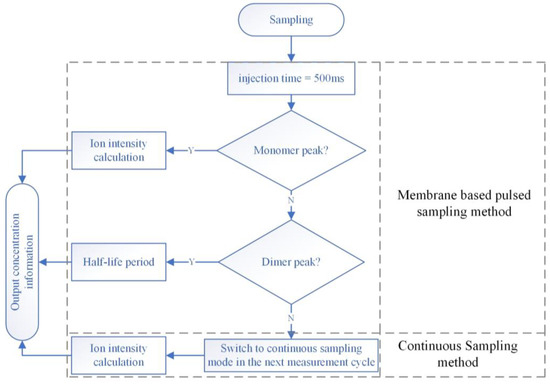 With given parameters of the proposed membrane-based pulsed sampling system, including the flow rate, thickness, and permeability of the membrane, the diffusion process is fixed, and the amount of analyte molecules that eventually penetrate the membrane can be correlated to the concentration of the analyte in the sample gas with a fixed relationship. In this case, for the same sample concentration, the amount of analyte to be ionized is much less than in the direct sampling method; hence, quantification of a higher concentration is possible.