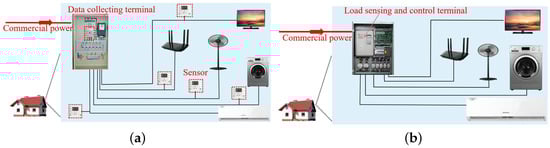 An efficient electric power management system is dependent on its electric load monitoring module [5,6,7], which can be realized using intrusive or non-intrusive approaches. In intrusive load monitoring (ILM) [8,9], as shown in Figure 1a, each electric load is monitored by a separate sensor, and the information acquired from all sensors can be centrally processed at the cloud end. And in non-intrusive load monitoring (NILM) [6,7,10], as shown in Figure 1b, only one monitor is required for each family or cell. It captures electric signals (such as voltage, current, and so on) at the commercial power input and transmits them to the cloud server in which the workload information of all loads is interpreted with algorithms. Apparently, NILM is preferable in smart city infrastructure for its simple design, energy efficiency, and low setup/maintenance cost.