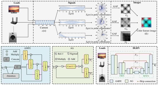 Inspired by the above analysis, an NILM method is proposed, as shown in Figure 3. First of all, the method employs a wavelet transform and discrete Fourier transform (DFT) to decompose the current signal into three feature sequences: (i) an approximation coefficient sequence with an envelope feature of the current signal; (ii) a detail coefficient sequence with a texture feature of the current signal; and (iii) a harmonic ratio sequence with a harmonic feature of the current signal. After that, it utilizes the GAF method to convert the above three sequences into gray-scale images and further set them as the R, G, and B channels of a color image. Through this operation, the differences between loads are highlighted to facilitate load recognition. Finally, a DLRN based on multi-scale features and a visual attention mechanism is proposed. These steps will be elaborated on as follows.