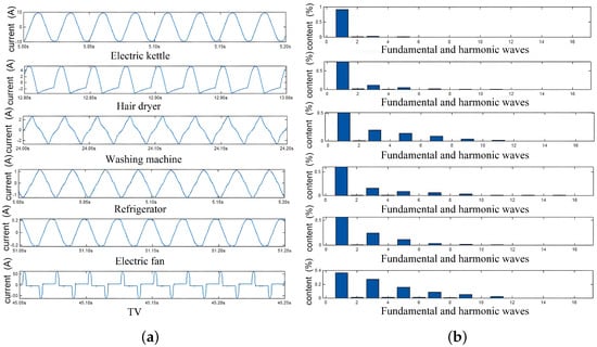 The harmonic contents of loads vary based on the electrical components and circuit systems. To verify the above assumption, this study explored the harmonic contents of different types of loads: resistive, pump-driven, motor-driven, and switching-powered. The results are shown in Figure 4, in which Figure 4a shows the current waves of typical loads, whereas Figure 4b shows their corresponding harmonic content. From this figure, the resistive loads (e.g., electric kettle, hair dryer) increase in heat with the resistors and barely have harmonic components. The pump-driven loads (e.g., washing machine, refrigerator) work mainly with a fundamental wave, but with more 3rd, 5th, and 7th harmonic components. The motor-driven loads (e.g., electric fan) are similar to pump-driven loads. They have 3rd, 5th, 7th, and 9th harmonic components that are lower the than fundamental wave. The switching-powered loads (e.g., TV, computer) adjust output voltages with high-frequency switches. They generate rich high-order harmonic components, such as 3rd, 5th, 7th, 9th, 11th, and 13th harmonic components, which are comparable with the fundamental wave. Obviously, the harmonic content, i.e., , is an effective feature used to recognize different types of loads.
