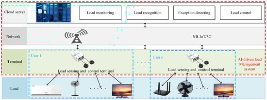 A practical AI-driven load management system can be implemented with the proposed load recognition method, as shown in Figure 7. This system was designed as a joint Terminal–Network–Cloud infrastructure for smart cities.