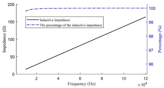 In Equation (1), L denotes the inductance, l denotes the length of the cable, r0 denotes the radius of the cable, and μ0 denotes the magnetic permeability of the cable, with its value being 4π × 10−7. Based on the above analysis, the magnitudes of the transmitter cable resistance and reactance on the cable, as well as the impedance distribution along the cable, can be determined, as shown in Figure 1. As depicted in Figure 1, the reactive impedance increases rapidly with frequency, resulting in a decrease in the magnitude of the emitted current.