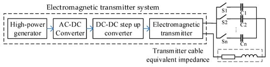 An electromagnetic transmitter system involves rectifying the alternating current provided by a high-power generator, boosting it through DC-DC conversion, supplying it to the transmitter, and transmitting it using long power cables. The transmission circuit using the traditional impedance matching technique is illustrated in Figure 2. To enhance the transmitted current, the DC voltage supplied to the transmitter must be maximized, and impedance matching is achieved using resonant capacitors [,,]. Compared to DC voltage boosting, the AC voltage can be boosted using a transformer, making the circuit and control simpler and more suitable for field operations. Relying solely on resonant capacitors for impedance matching fails to match multiple frequencies within the bandwidth and increases the device size as the bandwidth increases.
