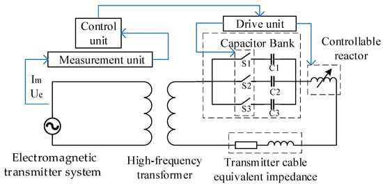 The circuit structure of the proposed high-frequency, high-current transmission technique based on adaptive impedance matching is illustrated in Figure 7. It primarily comprises six parts: a measurement unit, a control unit, a drive unit, an impedance-matching unit, and a high-frequency transformer. The measurement unit is responsible for measuring the transmission frequency in the circuit and the phase difference between the output voltage and output current at the transmitter end. It includes a high-precision current sensor, rectification module, voltage reduction module, and phase-difference measurement module. The phase-difference measurement module includes an AD8302 and a Field-Programmable Gate Array (FPGA), which measure the phase difference between the output voltage and output current at the transmitter end. The control unit is responsible for receiving the results from the measurement module, processing them, and controlling the drive unit accordingly. The drive unit includes a switching module for selecting the capacitor and controllable reactor corresponding to the transmission frequency, as well as a programmable DC power supply to control the reactor inductance. The switching module comprises MOS transistors and electromagnetic relays that effectively separate weak electrical control from strong electrical operation. A programmable DC power supply is connected to the reactor control windings. It enables the control unit to regulate the output current to a specific magnitude, thus achieving controlled variations in the high-current precisely controllable reactor. The impedance-matching unit contains resonant capacitors and a controllable reactor, forming a resonant network with capacitive and inductive components in the transmission loop, such as a transmission cable and high-frequency transformer, to achieve frequency selection for the transmitted signal.