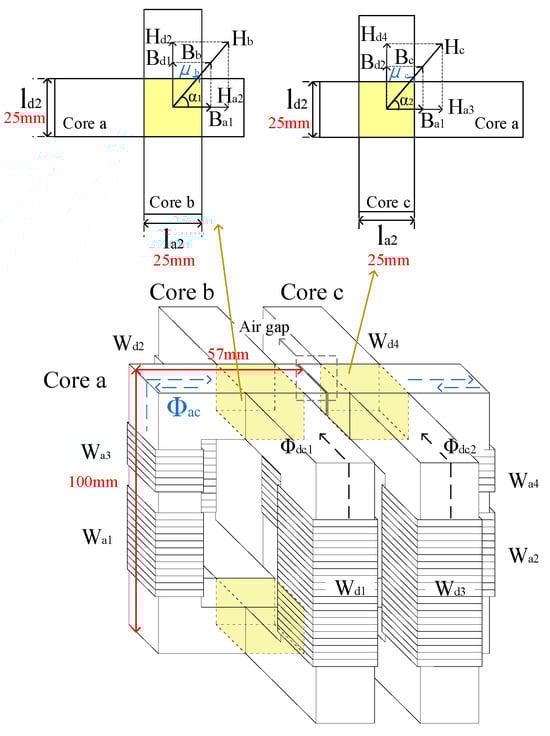 where μa1 is the magnetic permeability of the non-orthogonal part of the AC magnetic core. Referring to Figure 5, μb and μc represent the permeabilities of the orthogonal parts. Due to their anisotropic nature, the cores’ magnetization properties vary depending on the direction, with the material exhibiting better magnetization properties and, consequently, higher permeability in the rolling direction [,]. Subsequently, substituting the relationships ϕ = B∙S, where ϕ denotes the magnetic flux and S indicates the cross-sectional area, and Li = NΦ, where L denotes the inductance, N indicates the number of turns, i indicates the current, and Φ denotes the magnetic flux, into Equation (10) yields Equation (11).