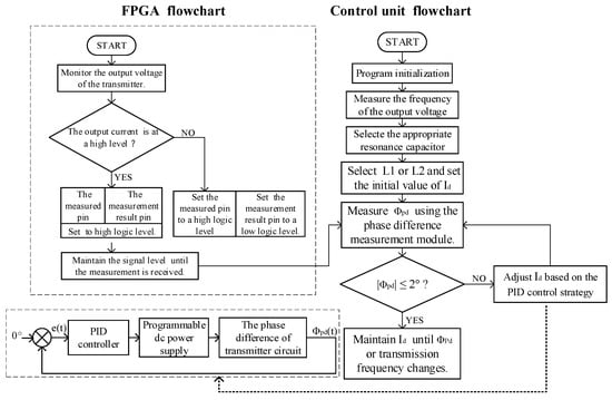 To process the data from the measurement unit and make corresponding controls on the driving unit, a control flowchart of the control unit based on a high-frequency, high-current transmission technique is illustrated in Figure 9. Initially, the resonant capacitor and controllable reactance inductor (L1 or L2) must be selected based on the measured transmission frequency, as calculated in the previous section. Subsequently, the phase difference between the output voltage and output current at the transmitter end is detected. A signal to start measuring the phase difference is sent to the FPGA. Upon detecting that the measured pin is at a logically high level, the level of the measurement result pin from the FPGA is read. Additionally, the VPHSm of the VPHS pin of the AD8302 is collected through the ADC. Once the collection is complete, a signal is sent to the FPGA to end the measurement. The control unit initially applies Kalman filtering to filter VPHSm, reducing errors. The phase difference was determined by combining the FPGA measurement results. When the FPGA measurement result pin is at a high level, the voltage signal is directly used to determine the phase difference. When the FPGA measurement result pin is at a low level, the voltage processing is performed using VPHS = (VZPD + VPHSm), ensuring a one-to-one correspondence between the phase difference angle and voltage information. The processed voltage VPHS is then used to determine the phase-difference angle at that moment, where VZPD represents the voltage information when the phase-difference angle is 0°. When the absolute value of the phase-difference angle is greater than 2°, a proportional-integral-derivative (PID) controller is employed to adjust the inductance value of the controllable reactance, ensuring that the circuit exhibits resistive characteristics. The error (e(t)) between the measured phase difference Φpd(t) and 0° at this point is used as an input into the PID controller. According to the PID control strategy, the control winding current of the high-current precisely controllable reactor is adjusted to change its inductance, thereby controlling the phase difference between the circuit voltage and current to maintain a resistive circuit. When the phase-difference angle is less than 2°, the control winding current is maintained. The phase difference must be measured when the circuit reaches a steady state during adaptive impedance matching using the controllable reactor. The resulting average adjustment time is approximately 4 s. During operation, the transmission frequency and phase difference between the output voltage and current at the transmitter end must be monitored continuously. If the transmission frequency changes, whether a need exists to change the resonant capacitor must be checked promptly. Timely adjustments to the control winding current are required when the phase-difference angle exceeds 2°.