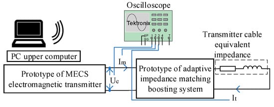 To further analyze the feasibility of the designed structure and control methods employing the proposed high-frequency, high-current transmission technique based on adaptive impedance matching, the design and assembly of a low-power prototype for indoor testing are herein described. In accordance with project requirements, a 217 µH fixed inductor and a 25 Ω high-power resistor were utilized to simulate collectively the inductance and resistance generated when laying a 100 m transmission cable during outdoor exploration. This simulation also considers the grounding resistance generated by the transmission electrode and the earth. Figure 11 shows a schematic of the test prototype, whose experimental circuit and on-site wiring are illustrated in Figure 12. To ensure the safety of the indoor testing, the output voltage of the transmitter was maintained at approximately 25 V, and the transmitter was controlled to transmit at different frequencies as required by the project. Additionally, the output voltage (Ue), current (Im) at the transmitter end, and transmission current (It) in the transmission circuit were continuously measured.