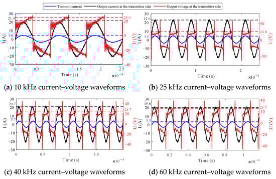Analyzing Figure 13 reveals that the transmission current waveform becomes a sinusoidal wave after impedance matching, with maximum values consistently exceeding 2.7 A. The output voltage at the transmitter is in phase with the output current.