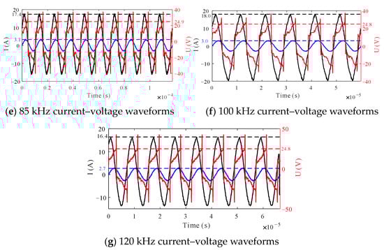 To analyze the phase relationship between the output voltage and output current, different phase waveforms of the output voltage and output current are illustrated in Figure 8b. When the rising edge of the output voltage occurs and the emitter current is low, the output voltage leads to an output current, indicating an inductive circuit. Conversely, if the output current is high, the output voltage lags the output current, suggesting a capacitive circuit.