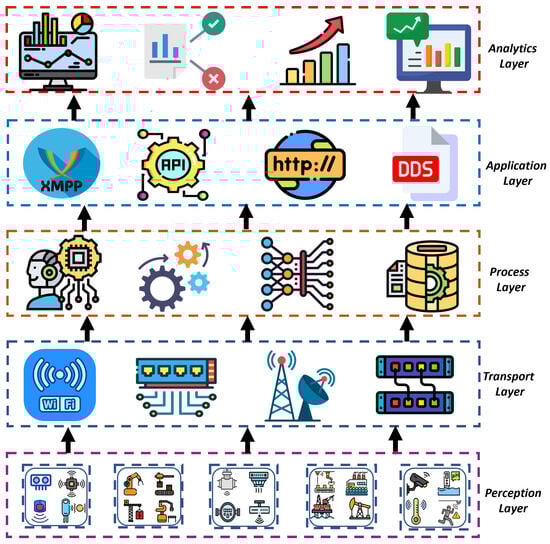 The proliferation of IoT devices, the diverse nature of these devices, and the evolution of communication protocols have led to a surge in enabling technologies from an engineering standpoint [19]. AI and ML techniques have further enhanced the potential of IoT by extracting insights from heterogeneous sensor data, thereby reshaping business operations [18,20]. The modular design of IoT systems, which abstracts these systems into separate components, enhances their adaptability and clarifies their architecture [20]. As in Figure 1, the layered structure of IoT comprises the perception, transport, processing, application, and analytics layers. The perception layer encompasses physical devices that sense the environment and communicate data to higher layers, while the transport layer facilitates communication between devices and cloud-based services. The processing layer, typically hosted on edge or cloud platforms, provides storage and computation capabilities, enabling scalability and interoperability. The application layer governs system operations, interacts with users, and manages logical processes. Finally, the analytical layer offers users actionable insights, enhancing decision-making. However, security challenges persist, particularly in resource-constrained IoT devices and cloud-based middleware, highlighting the need for robust security measures [20].
