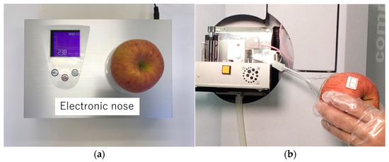 The sugar content (Brix) and ripeness of apples were measured on the same day as the e-nose measurement. A nondestructive brix meter PAL-HIKARi 5 (Atago, Tokyo, Japan) was used to measure sugar content (%), and a nondestructive ripeness meter PAL-HIKARi Ripeness (Atago) was used to measure ripeness (%). According to the manufacturer’s instructions, the side surface of the fruit was mounted on the sensor and measured three times by changing the surface position to be measured, and the average values and sample standard deviations were calculated.
