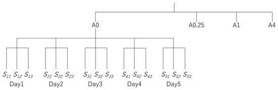 Nested design image for the five measurement days in this study. A0–A4 indicate balm-coated area (0–4 cm2). Sxy indicates sensor value for measurement number y on day x.