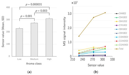 The apple samples were placed on the top plate of the e-nose device and measured from the calyx side (Figure 1a). Three apples with sensor averages differing by more than 30 were selected to investigate the correlation between the sensor values and the signal intensity of mass spectrometry. The three apples were tested, and they exhibited different sensor values: 228.7 ± 8.14 (low), 273.3 ± 6.11 (medium), and 308.7 ± 8.14 (high), with a difference of more than 30 sensor values. (Figure 3a). These sensor values showed significant differences in a one-way ANOVA (p = 0.000039); in addition, significant differences were observed between low and medium (p = 0.001), low and high (p = 0.000031), and medium and high (p = 0.003) (Figure 3a).