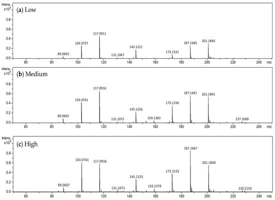 Representative data from direct mass spectrometry of apples displaying (a) low, (b) medium, and (c) high sensor value.