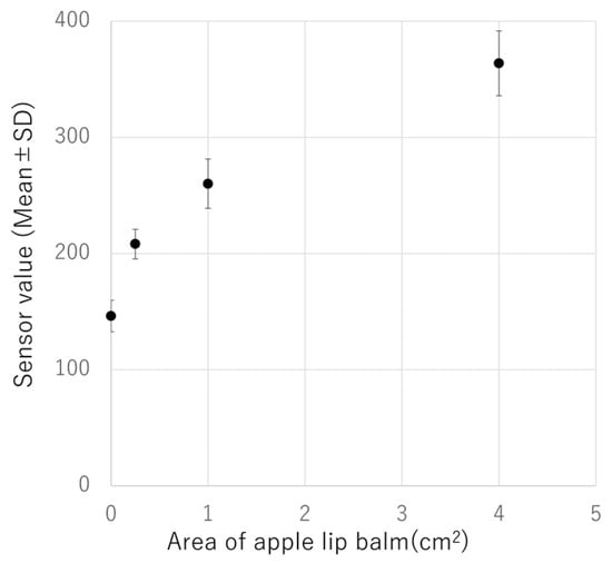 An apple-scented lip balm (Delicious Lip Cream, SUNSMILE Inc., Tokyo, Japan) was used as a standard to measure the scent of the apples. Lip balms are advantageous because they can be easily applied without the need for special tools. As a method of coating, a square (0, 0.25, 1, or 4 cm2) was drawn on a piece of paper (7.5 cm × 7.5 cm) and lip balm was applied inside the square. The paper was immediately aligned with the center of the hole on the top plate of the e-nose device and the sensor measured the VOCs from the back of the paper. The paper itself (not lip balm-coated) was used as a control (0 cm2). These measurements and applications of the balm were performed in triplicate per area. These measurements were repeated on five different days (four levels of concentration (coated area) × three measurements × five days; Figure 2), and the average value and standard deviation were calculated. The approximate curve formula was calculated using the MATLAB curve-fitting toolbox (MathWorks, Natick, MA, USA).