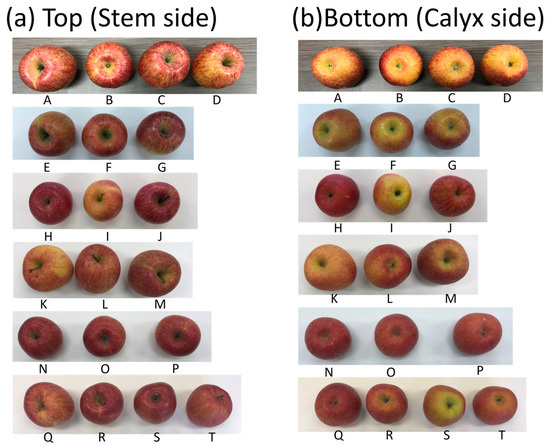 Apple samples (A–T) for the comparison of e-nose sensor (aroma), sugar content, and ripeness values. (a) Top (stem side) image, and (b) bottom (calyx side) image.