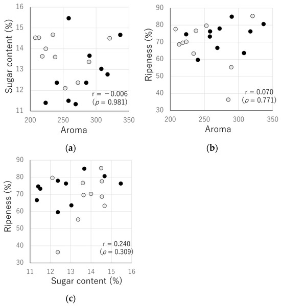 Comparison of e-nose sensor values (aroma), sugar content, and ripeness. (a) aroma and sugar content; (b) aroma and ripeness; (c) sugar content and ripeness (●: February, ●: March).