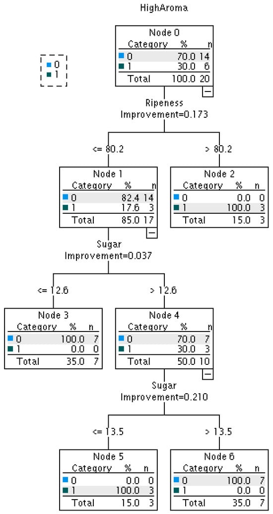Decision tree for the top 30% of high aroma intensity apples (■1, aroma intensity > 289) using sugar content and ripeness values of 20 apples. Decision tree was calculated using IBM SPSS Statistics 28. ■0 indicates aroma intensity ≤ 289.