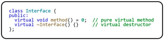 The reason we will discuss this principle in more detail is that the C++ language does not natively support interface. When an interface is to be created in C++, it is based on an implementation of an abstract class that has one or more purely virtual methods. An example of an interface implementation in C++ is shown in Figure 1.