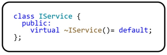 As you can see from the code, a virtual destructor must be implemented for each interface (Interface) created in C++ to ensure proper resource release when the instance of the class implementing this interface is removed. At the same time, all methods that we want to implement in a derived class must always be defined as purely virtual. The class that defines the interface is created in the following code sample in Figure 2.