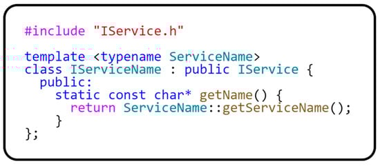 Therefore, when programming on microcontrollers, static typing and other techniques that do not require additional resources or reduce the complexity of our code are preferable. Using these assumptions, we have designed our own class implementation based on the service locator design pattern adapted to the constraints of microcontrollers. Figure 3 shows a class diagram of the service locator pattern implementation that uses the primary IService interface. This interface implements any service or object that can register to the ServiceLocator class. The implementation of this interface is shown in Figure 4.