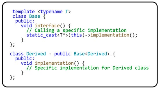 This is a design pattern that allows for static polymorphism by having the derived class inherit from a template base class to which it passes itself as a template parameter. This approach provides base class elements to behave differently for different derived classes without needing virtual functions [21]. Figure 6 shows an example of CRTP implementation in simplified form.