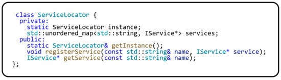 Another design pattern that follows the IoC principle is the service locator. The service locator implements IoC by having objects obtain their dependencies from a central registry instead of injecting and managing the object lifecycle as in DI containers. Using this approach, we can optimize resource utilization, making this pattern more suitable for implementation in a microcontroller environment. To optimize the implementation of this pattern, using both memory and computational performance, we will not use run-time-type information (RTTI) in the implementation [18,19,20]. RTTI is a mechanism that allows us to obtain data-type information at run-time. While RTTI is useful in standard programming, its use is often inappropriate for microcontrollers for several reasons: