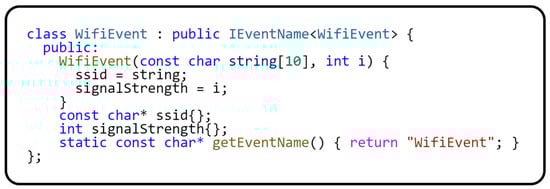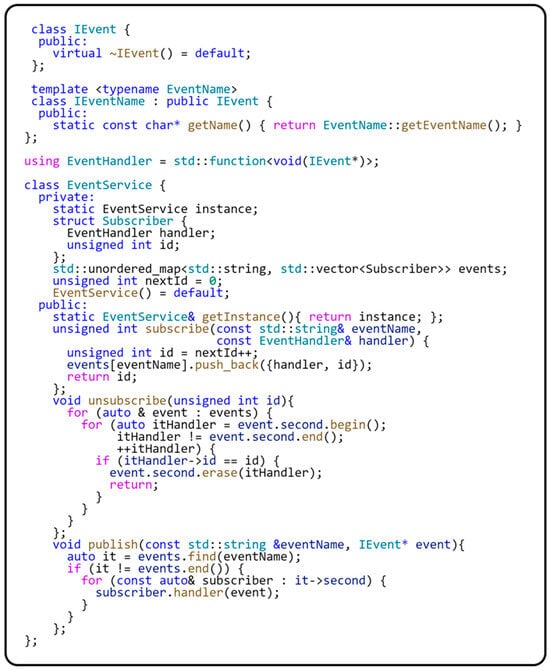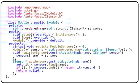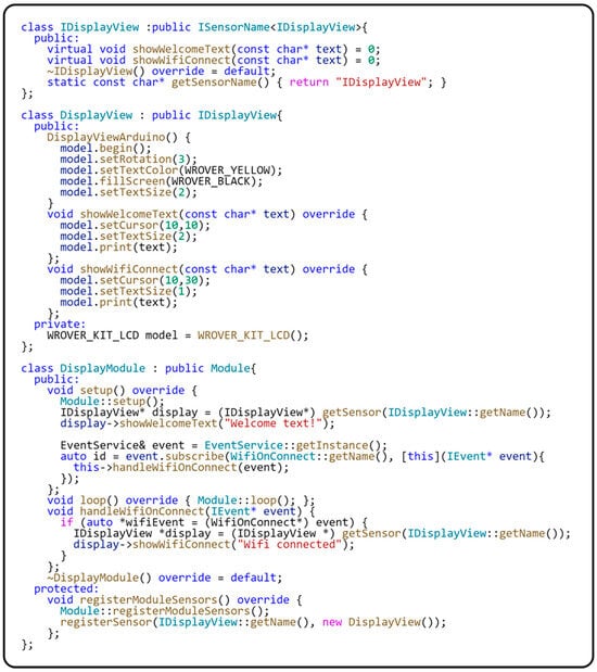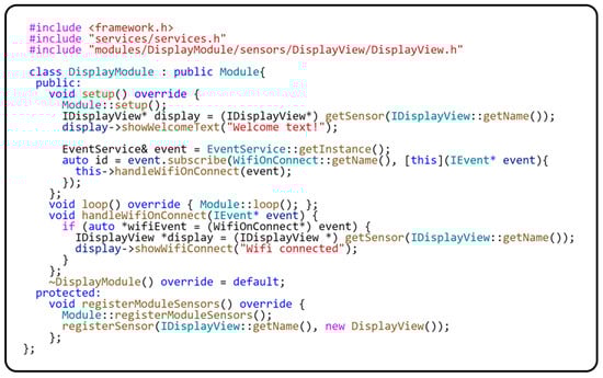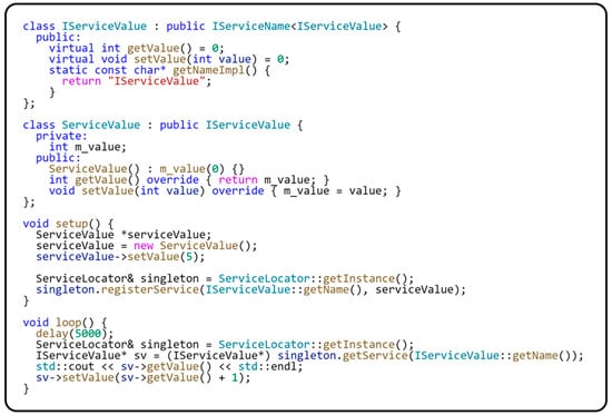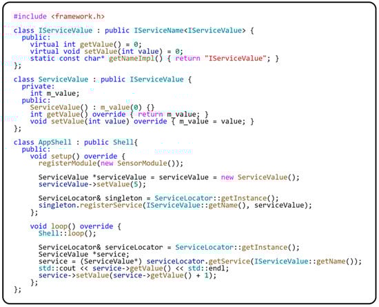 Communication between modules through shared services is another method of interaction in modular systems. Within our framework, the ServiceLocator design pattern is used for this purpose. The section dedicated to implementing SOLID principles on microcontrollers provides a detailed description and implementation of this design. The main advantage of this approach is that it allows modules to access services and resources without the need for a hard dependency on specific implementations of these services. In this way, services can be dynamically exchanged or updated without significant impact on individual modules, greatly increasing the application’s flexibility and scalability. ServiceLocator also enables centralized service management, simplifying the system configuration and maintenance. This design pattern is particularly useful in microcontroller applications, where it is crucial to minimize dependencies and keep software complexity low while maintaining a high level of modularity and testability. The following code in Figure 16 illustrates how easily a shared service can be implemented and registered using our framework.