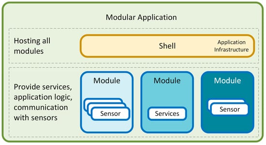 Modularization within this framework should involve the development of separate functional units and modules that are independent but can communicate freely with each other. Each module should contain some part of the application’s functionality; this can be application logic, communication with sensors, or infrastructure services. This approach facilitates the application’s development, testing, deployment, and maintenance, as each module can be developed and tested independently while contributing to the overall functionality of the system. Figure 9 shows a block diagram of a modular application.